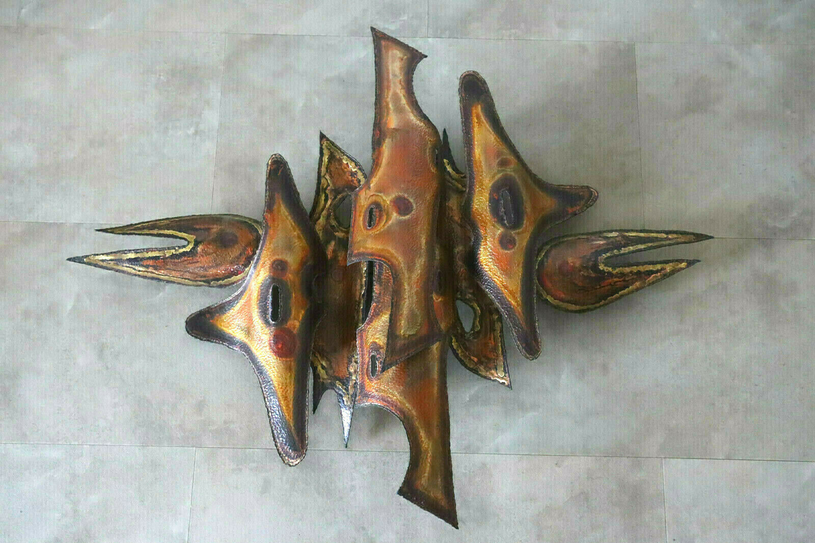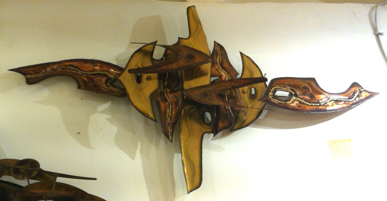 Canadian artist Edward Oliver (b.1933, Edmonton AB; d. 1986, Surrey, BC) rose to prominence in the heyday of Vancouver’s “Gastown” arts and crafts scene in the 1970s. Oliver discovered metal artwork during trips to California in the early 1960s. He opened his first gallery in Edmonton, Alberta in 1970, in an old warehouse that he converted into a hippie arts and crafts mall which he called Old Market Lane. He rented out partitioned sections of the building to various small shops – clothing, fabric, candle, and incense shops, a used record store, and other artisan and artist stalls. He kept the largest space at the back of the building for his gallery, which he named Metalmorphosis.