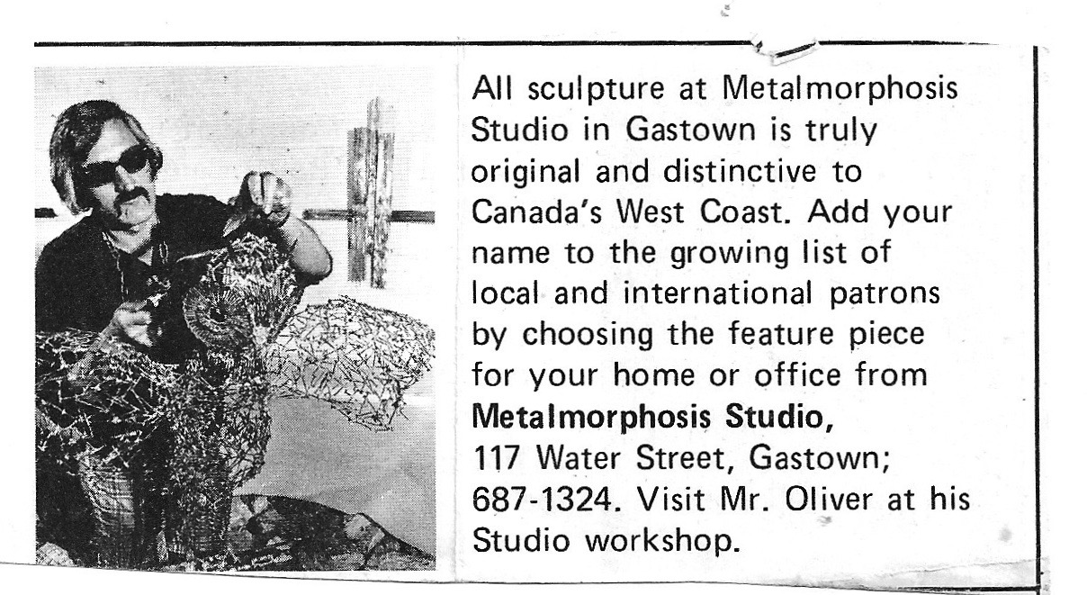 In 1972, he moved to Vancouver and opened shop in Gastown at 117, and within a year 165 Water St. Soon after, he bought the Terminus Hotel at 28-32 Water Street, creating the largest independent metal artwork gallery on the west coast, initially in partnership with fellow artist Michael Hewitt, though they parted ways a few years later. Metalmorphosis Gallery sold to art lovers from around the world until 1977, when a massive heart attack forced Oliver into early retirement. Edward Oliver died in 1986.